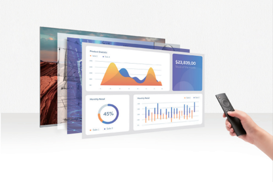 ④ 遙控控制,無(wú)線極速投屏:像操控一臺(tái)大電視一樣簡(jiǎn)單易用,可通過(guò)遙控器實(shí)現(xiàn)開(kāi)關(guān)機(jī)、亮度/色溫調(diào)節(jié),內(nèi)容切換,上下翻頁(yè)等功能。支持電腦、手機(jī)、平板等設(shè)備投屏,多種設(shè)備同時(shí)在線操作,分享不受“線”制。